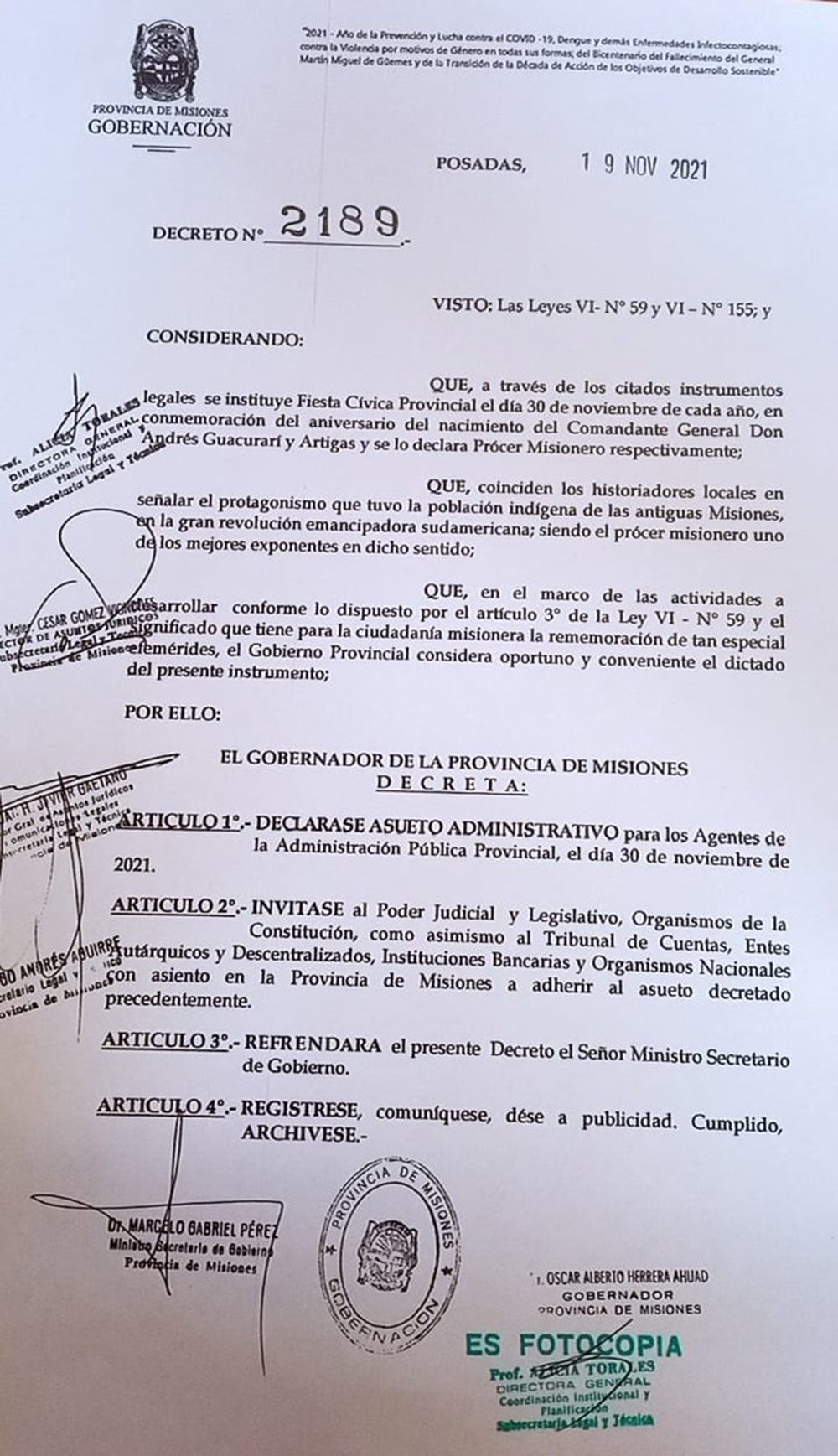 Efemérides Asueto administrativo para el 30 de noviembre en Misiones Por Sergio Daniel Contrera - 23 de noviembre de 2021 0 FacebookTwitterWhatsAppTelegram La medida alcanzará a todos los agentes de la administración pública provincial, aunque se invita a adherirse al Poder Judicial y Legislativo, Tribunal de Cuentas, y otras instituciones.