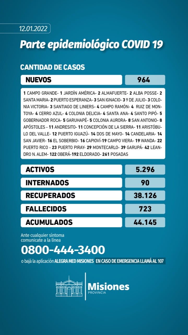 Este miércoles se informaron otros 964 nuevos casos de coronavirus en la provincia. El total de casos alcanzó los 44.145 contagios, de los cuales 5296 son activos (122 en Oberá, 192 en Eldorado y 261 en Posadas) y el número de internados en terapia intensiva subió a 90.