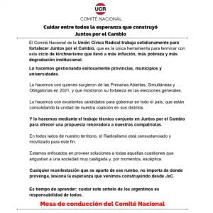 “Es tiempo de aprender: cuidar este anhelo de los argentinos es responsabilidad de todos”, concluye el comunicado de la conducción nacional, a cargo del gobernador jujeño Gerardo Morales.