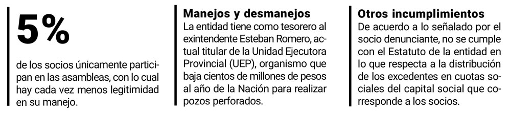 Incluso en 2022, Barrios había solicitado al Ministerio de Acción Cooperativa que intervenga “como órgano de contralor” para que se cumplan los artículos 26, 27, 28 y 29 del Estatuto de la entidad, “que disponen que los excedentes repartibles sean distribuidos en cuotas sociales, lo cual no se ha realizado”.