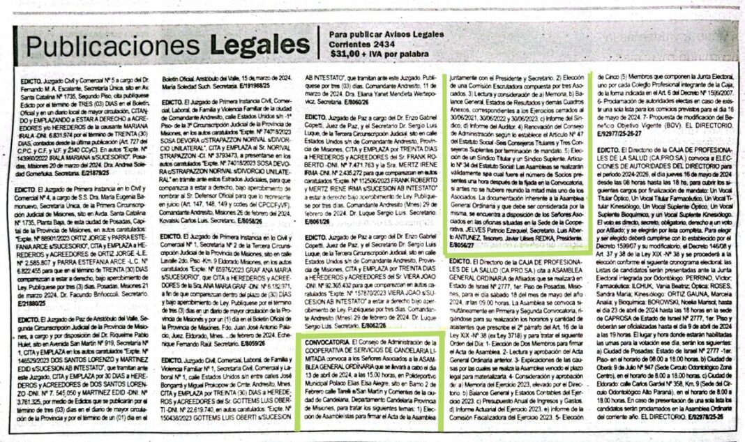 El consejo de administración de la cooperativa de servicios de candelaria limitada convocan los señores asociados a la asamblea general ordinaria que se llevará a cabo el día 13 de abril de 2024 a las 15 horas en el polideportivo municipal “polaco Elias Elsa alegre” Sito en Barrio 2 de febrero esquina San Martín y corrientes de la ciudad de candelaria, departamento Candelaria, provincia de Misiones para tratar los siguientes temas: 1) elección de asambleístas para firmar el acta de asamblea juntamente con el presidente y secretario. 2) elección de una comisión escrutadora compuesta por tres asociados. 3) lectura y consideración de : a) memoria. b) balance general estados de resultados y demás cuadros anexos correspondientes a los ejercicios cerrados al 30/6/2021 30/6/2022 y 30/6/2023 c) informe del síndico. d) informe del auditor. 4) renovación del consejo de administración según lo establece el artículo número 47 del estatuto social, seis consejeros titulares y tres consejeros suplentes por terminación de mandato. 5) elección de un síndico titular y un síndico suplente. Artículo número 34 del estatuto social: las asambleas se realizarán válidamente sea cuál fuera el número de socios presentes una hora después de la fijada en la convocatoria Si antes no se hubiere reunido la mitad más uno de los asociados. La documentación inherente a la asamblea general ordinaria y que debe ser considerada por la misma se encuentra a disposición de los señores asociados en las oficinas situadas en la sede de la cooperativa Gelvez Patricio Ezequiel secretario, Luis Alberto Antúnez tesorero, Javier Ulises Redka presidente edicto 8056 27