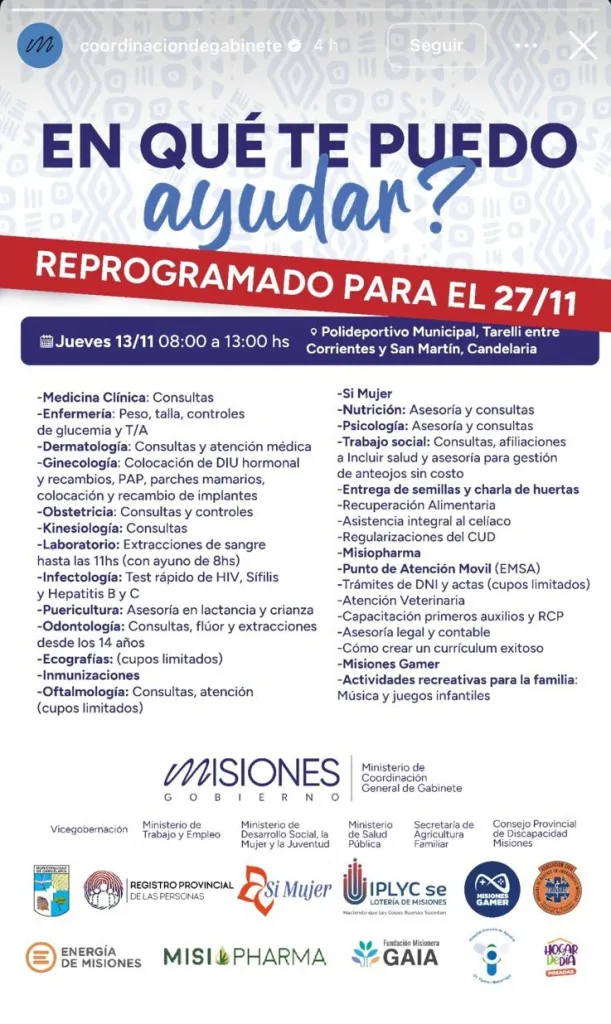 El operativo integral “¿En qué te puedo ayudar?”, que debía realizarse días atrás en Candelaria, fue reprogramado para el jueves 27 de noviembre, debido a las condiciones climáticas.