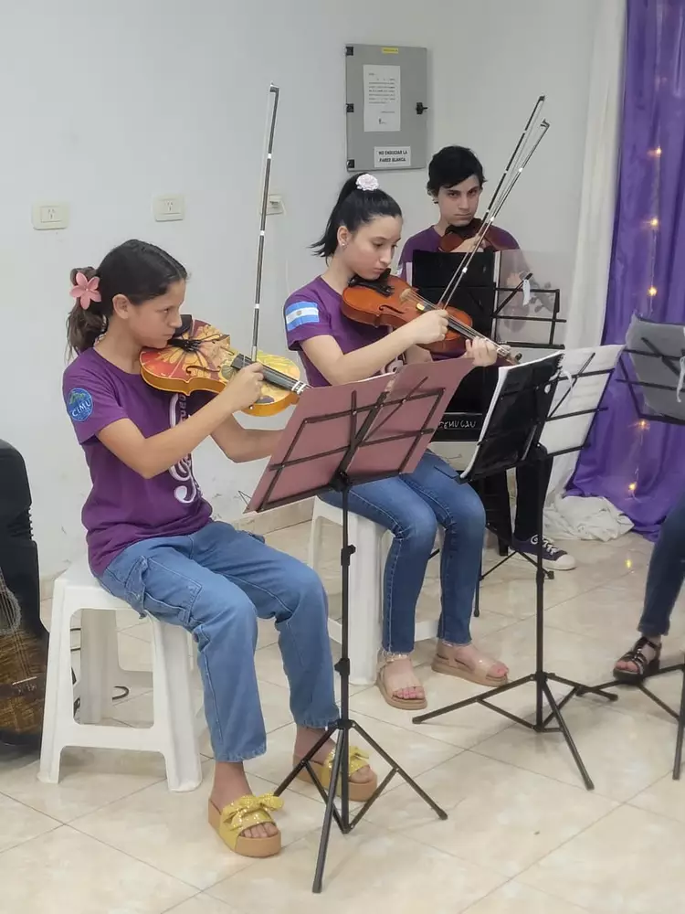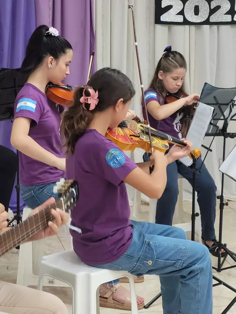 Los estudiantes pueden elegir entre varios instrumentos y reciben los instrumentos en préstamo (comodato), lo que permite su acceso a más chicos y chicas.