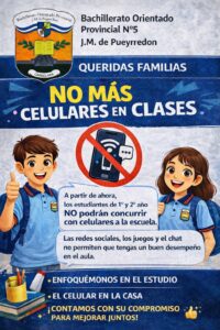 La comunidad educativa del Bachillerato Orientado Provincial N°5 “J.M. de Pueyrredón” de Candelaria informó que, a partir del ciclo lectivo 2026, los estudiantes de 1° y 2° año no podrán asistir a clases con celulares.